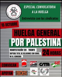 Compartimos este programa de Radio Almaina que escuchamos mañana a las 10:00 h desde Contrabanda FM para acompañar la jornada de huelga general por Palestina de 15 de octubre a la que nos sumamos.