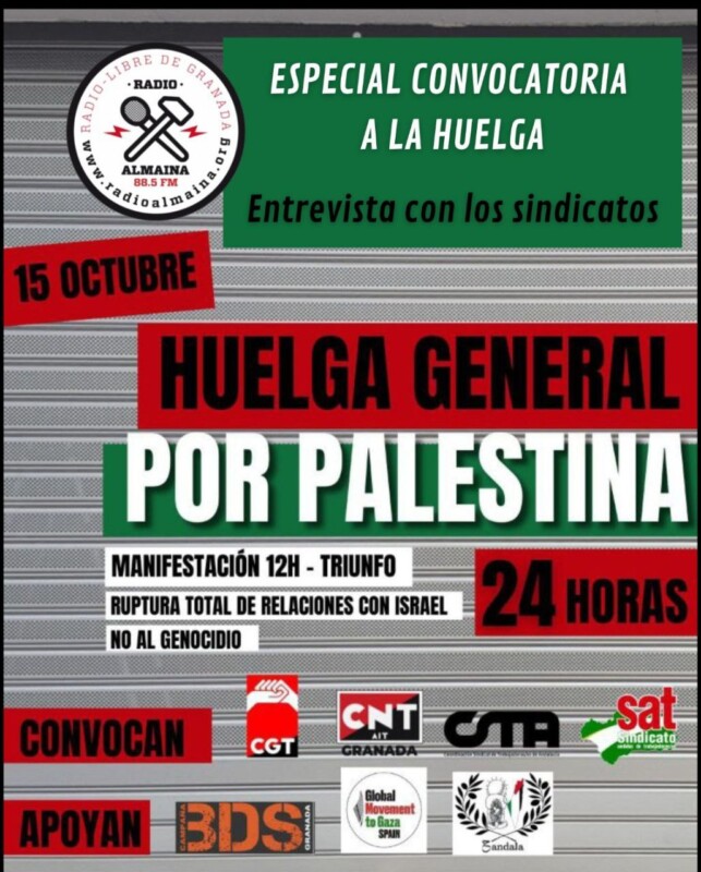 Durante este programa, animaremos a la participación junto a los sindicatos convocantes en la cuidad de granada. Entrevistaremos a compañeres de CGT, CNT ait, del Sindicato Andaluz de Trabajadores, de la Coordinación Sindical de Trabajadores/as de Andalucía y de la Asamblea de Estudiantes permanente, con les que compartiremos las razones de por qué debemos mostrar nuestra más sólida y tajante solidaridad con el pueblo palestino a través del recurso histórico de la huelga general como medida de presión popular.