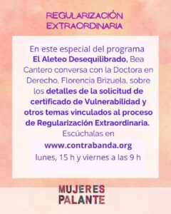 En este programa de El Aleteo Desequilibrado, de Contrabanda FM, Bea Cantero conversa con la Doctora en Derecho, Florencia Brizuela, sobre los detalles de la solicitud de Certificado de Vulnerabilidad y otros temas vinculados al proceso de Regularización Extraordinaria.